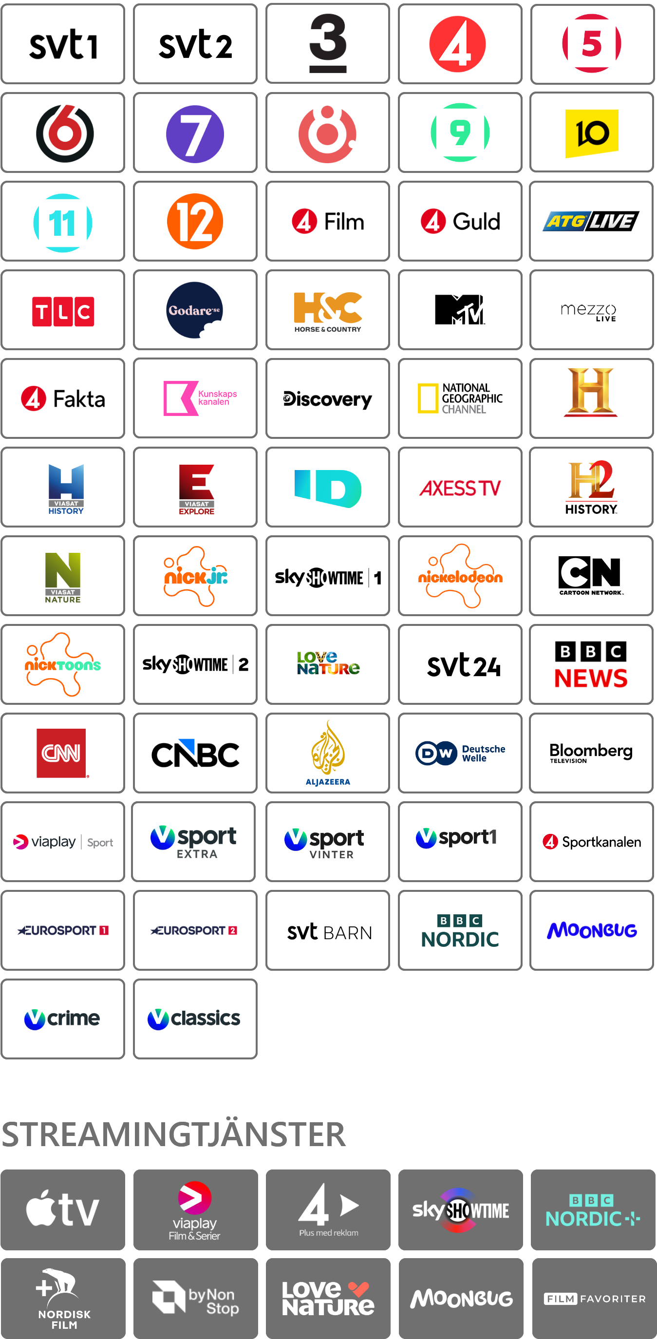 Familjefavoriten med en perfekt mix av underhållning, sport och streaming! Här får du ett brett kanalutbud med mycket att välja på – sport, fakta, nyheter, underhållning och massor av tv för barn.